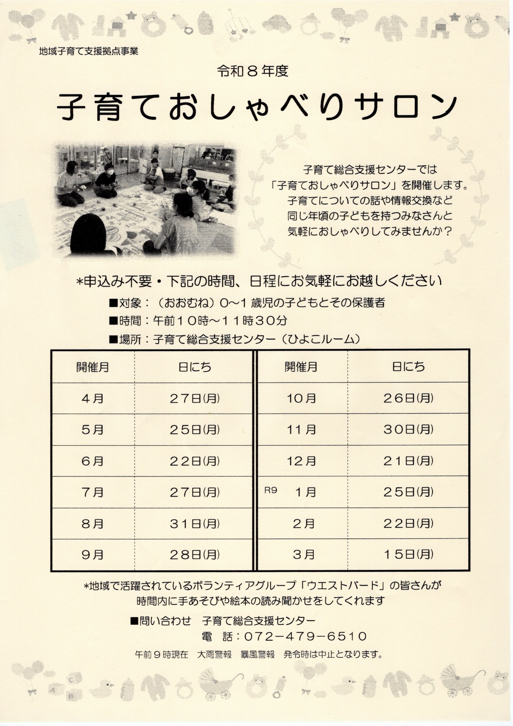 子育て総合支援センターでは 「子育ておしゃべりサロン」を開催します。 子育てについての話や情報交換など同じ年頃の子どもを持つみなさんと気軽におしゃべりしてみませんか?