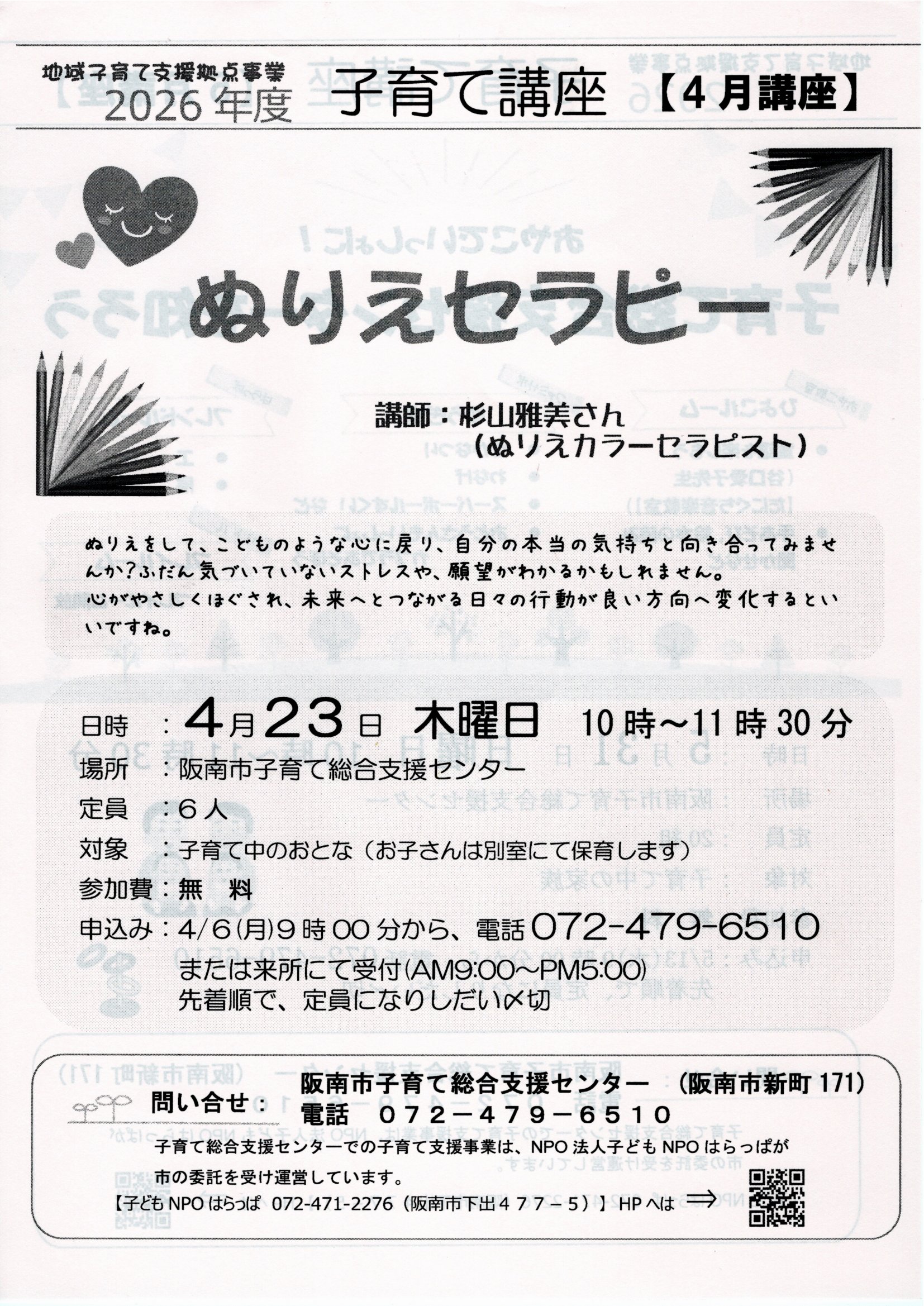 申込み: 4/6(月)9時00分から、電話072-479-6510