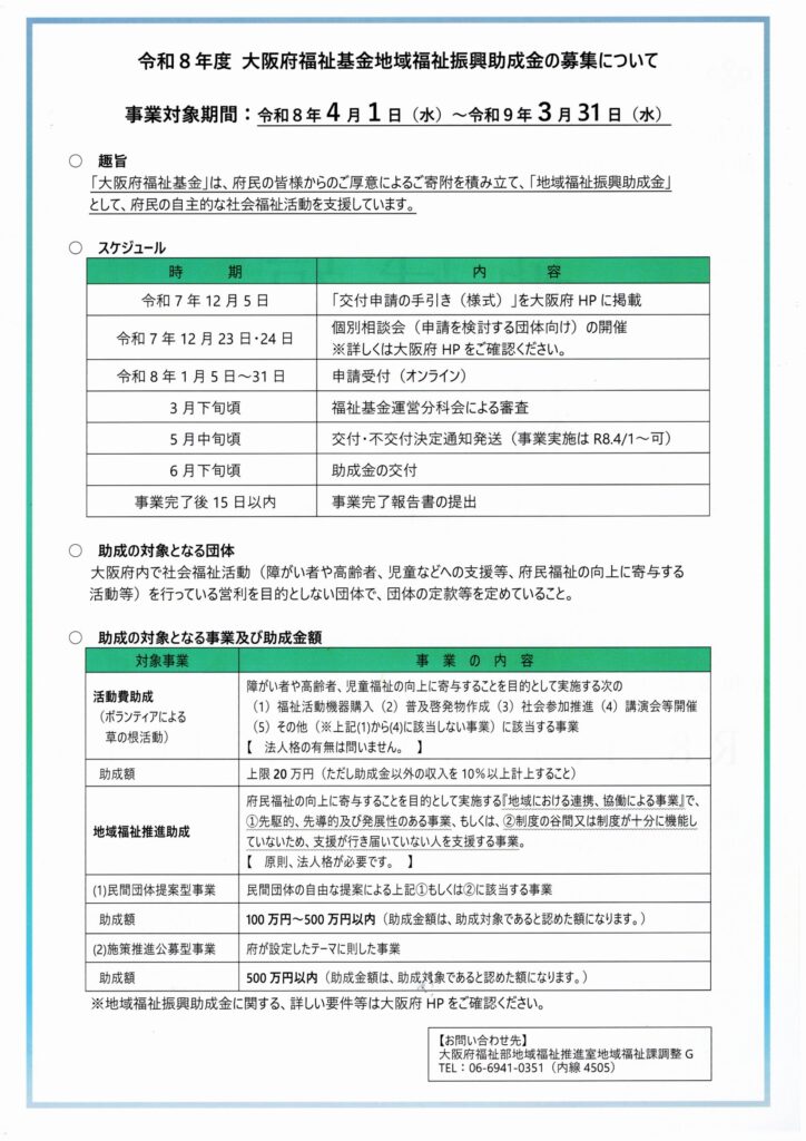 大阪府内で社会福祉活動(障がい者・高齢者・児童などへの支援)など、府民福祉の向上に寄与する活動を行っている非営利団体に対し、大阪府福祉基金から助成しています。