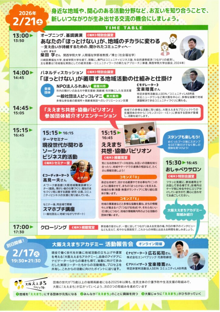 身近な地域での、住民同士の支え合い・助け合いの活動で、 いくつになっても誰もが住みなれたその土地に心地よく暮らし続ける”ええまちづくり”に、ご関心のある方の参加をお待ちしています。